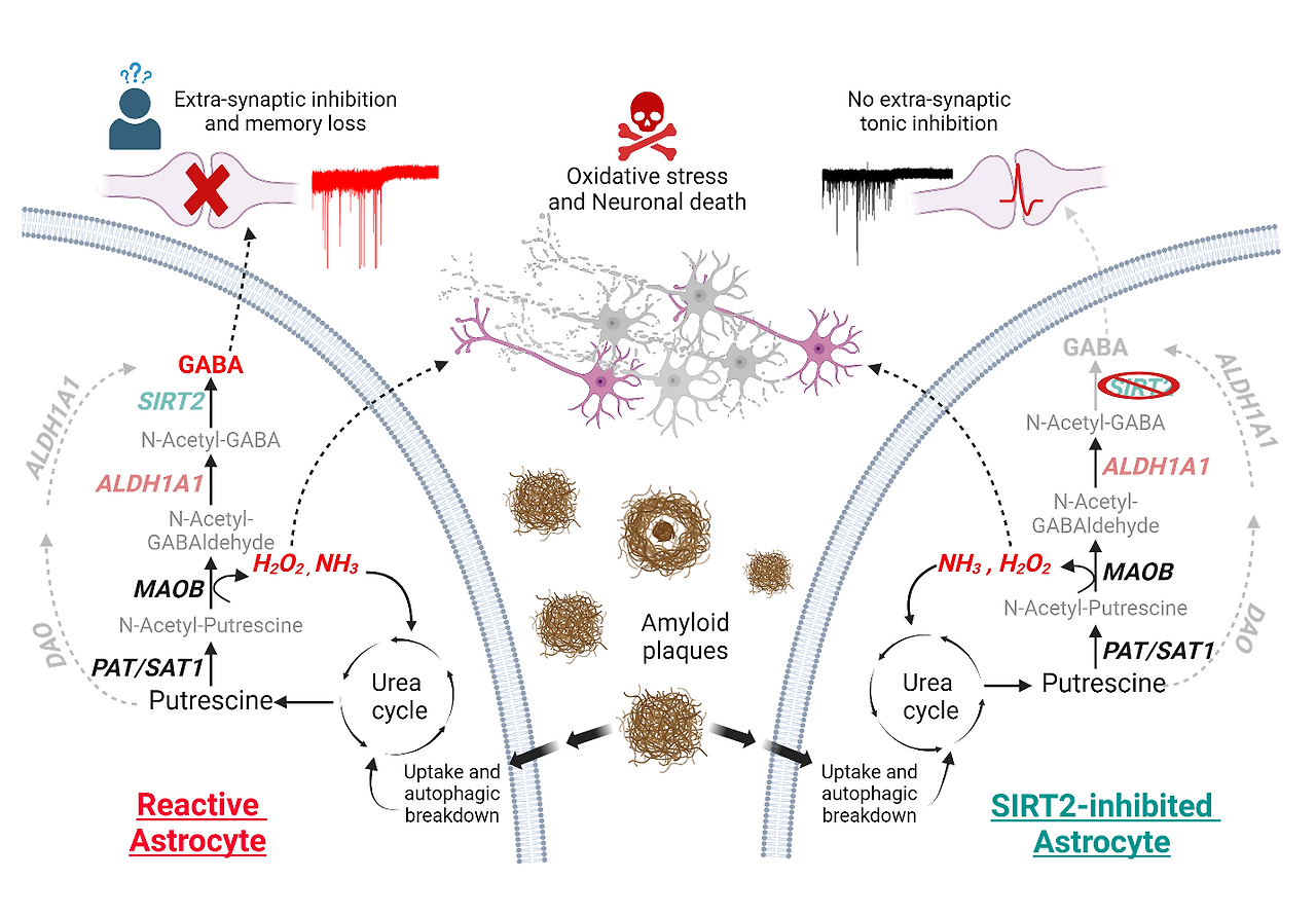 연구진은 앞선 연구에서, 유해한 암모니아를 해독해 요소를 만드는 ‘요소회로(urea cycle)’가 간뿐만 아니라 뇌 속 별세포에도 존재함을 밝히고, 그 대사 경로를 규명한 바 있다. 반응성 별세포에서 요소회로가 활성화되면 중간 대사물질인 푸트레신(putrescine)을 생성하고, 이 푸트레신은 모노아민 산화효소-B(MAO-B)를 거쳐 억제성 신경전달물질인 가바(GABA)와 활성산소인 과산화수소(H2O2)를 과도하게 생성한다. 이렇게 과생성된 가바는 뇌의 신호전달을 억제해 기억력 감퇴를 유발하며, 과산화수소는 신경세포를 손상시켜 알츠하이머 증상을 악화시킨다.